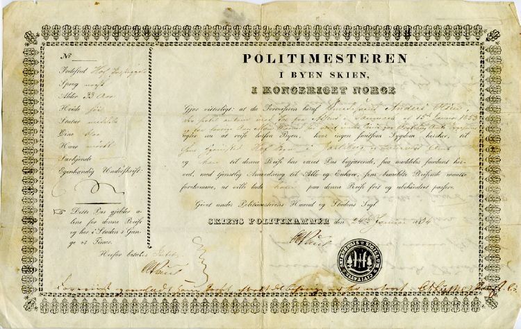 Issued by the chief of police in Skien January 24, 1854. Blacksmith Anders Olsen who arrived in Skien with a passport from Assens in Denmark dated January 15, 1853, and who had since May last year been undergoing a treatment at the Bratsberg Amt Hospital, is now intending to travel to his home-parish of Hof in Jarlsberg and Laurvig County.